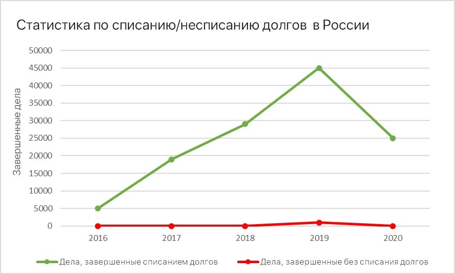 По нашим данным в настоящее время около 122 755 граждан в России полностью освободились от долгов и лишь около 2 173 не списали свои долги по завершению процедуры банкротства, что составляет менее 1,74% от общего количества завершенных дел.